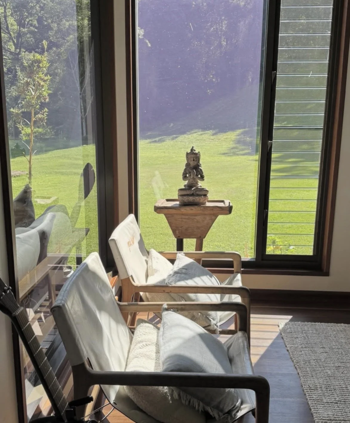 A light-filled 55m² studio surrounded by forest views and an outdoor deck, thoughtfully designed for breathwork, yoga, embodied movement, and group workshops. Natural light, fresh air, and the quiet presence of the surrounding landscape create a grounded and supportive environment for deep inner work.